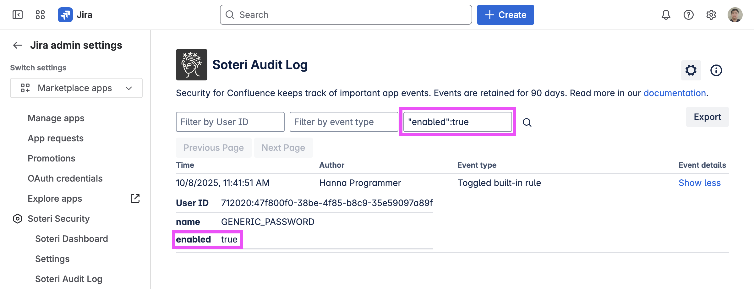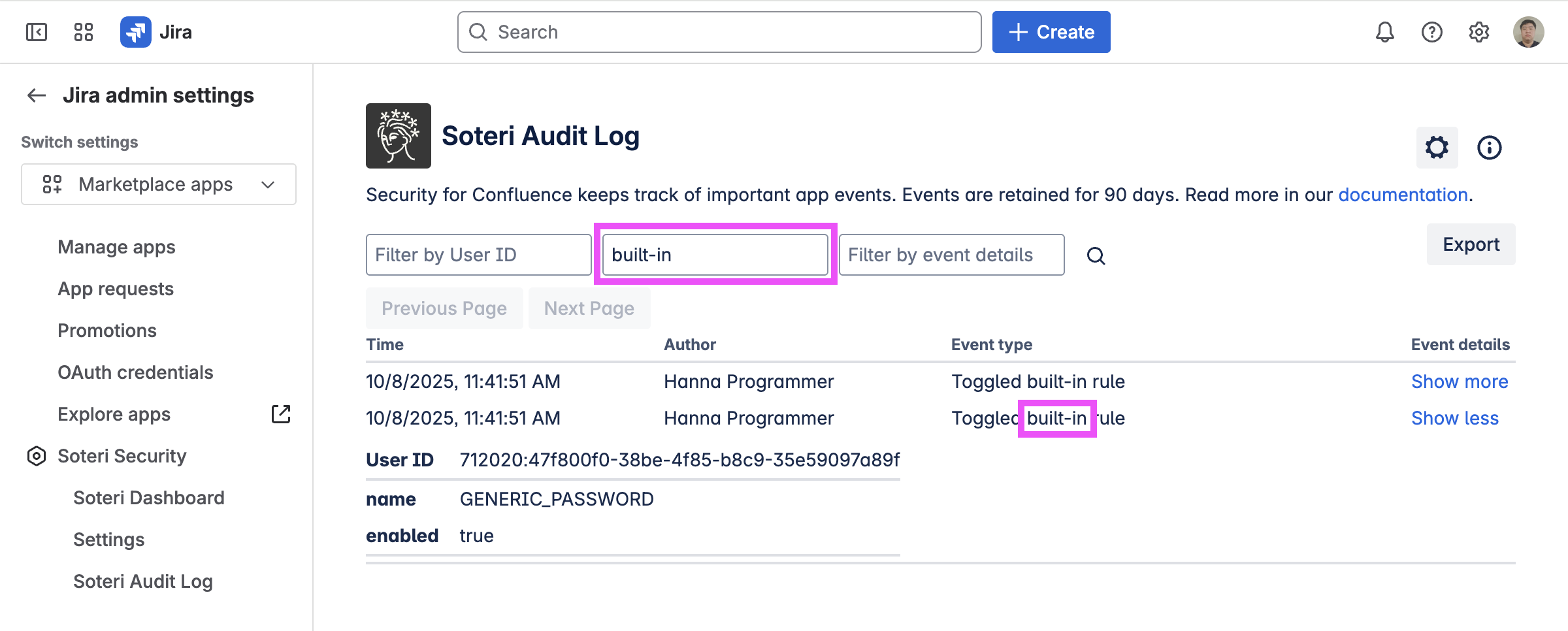 To help administrators keep track of various events, Security for Jira Cloud has an audit log. Due to Atlassian policies, we cannot write to the Atlassian audit log.