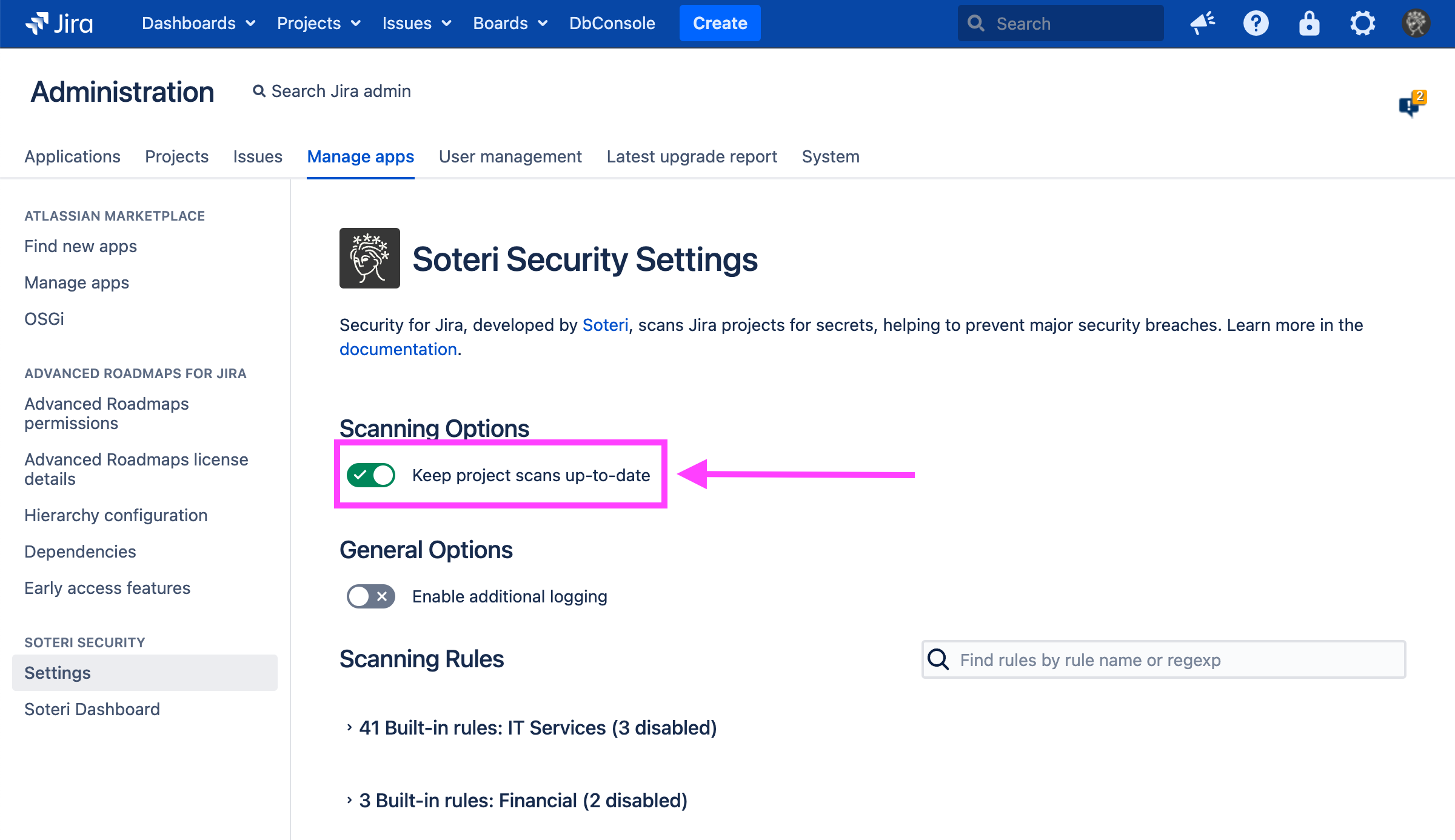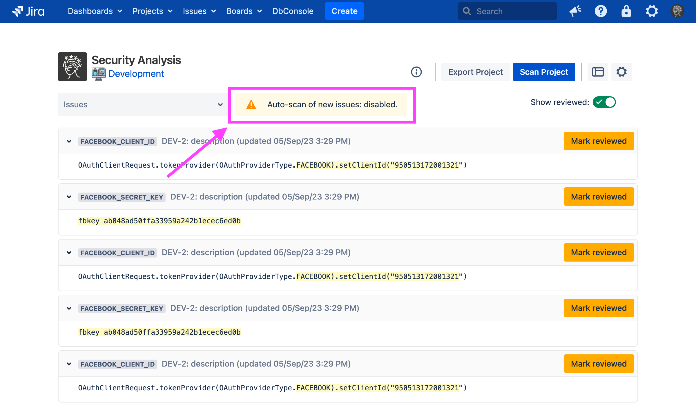 By default, Security for Jira will automatically scan newly created projects and imported projects. Also, for existing projects which have been scanned at least once, Security for Jira will automatically scan new and updated issues.
