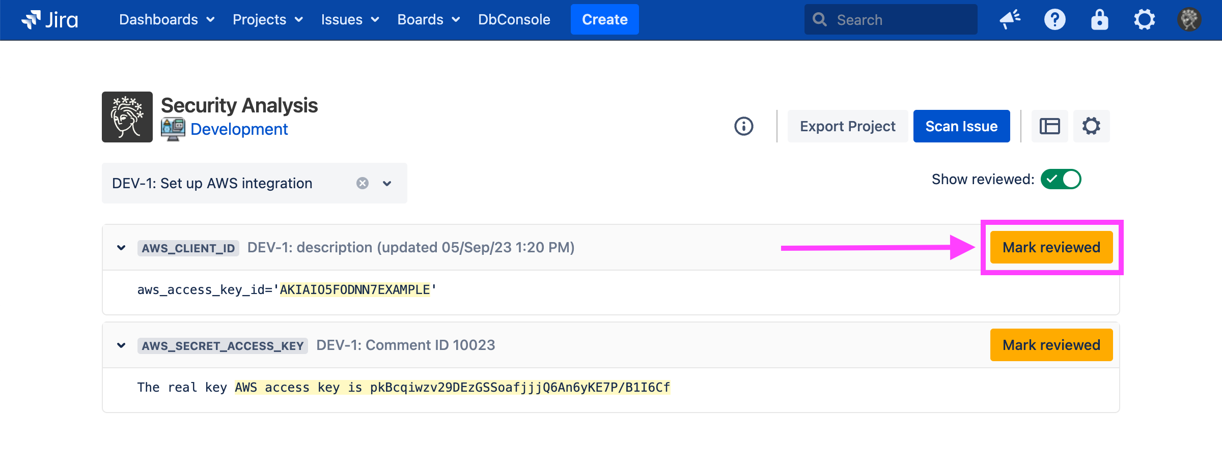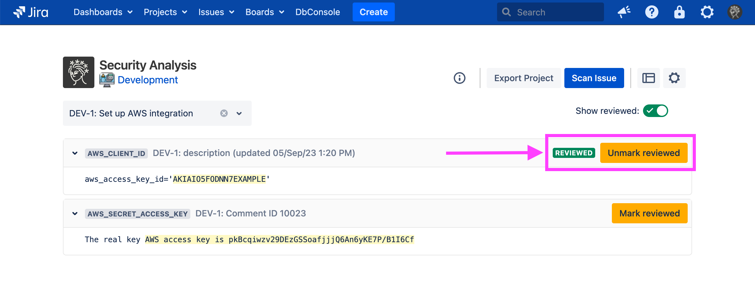 Marking a finding as reviewed saves the exact string captured by the rule (in this case, AKIAIO5FODNN7EXAMPLE). That exact string will be marked as reviewed for all existing and future scans.