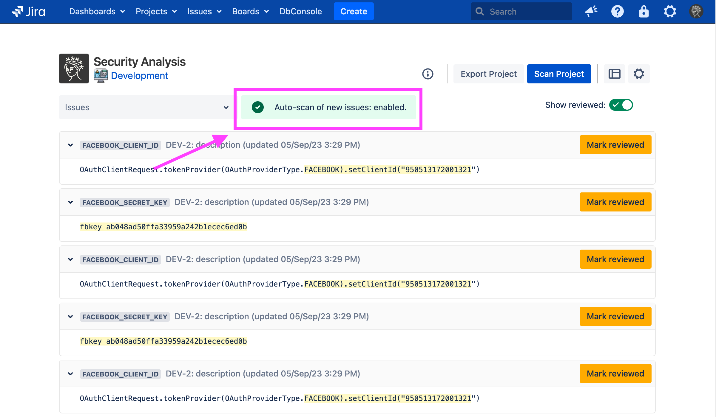 By default, Security for Jira will automatically scan newly created projects and imported projects. Also, for existing projects which have been scanned at least once, Security for Jira will automatically scan new and updated issues.