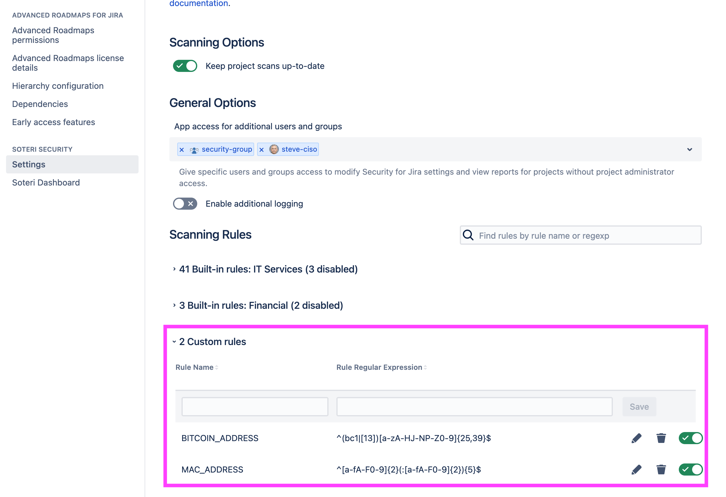 Security for Jira allows you to create custom scanning rules using regular expressions. You can create and edit custom rules from the Settings page, under “Custom rules”: