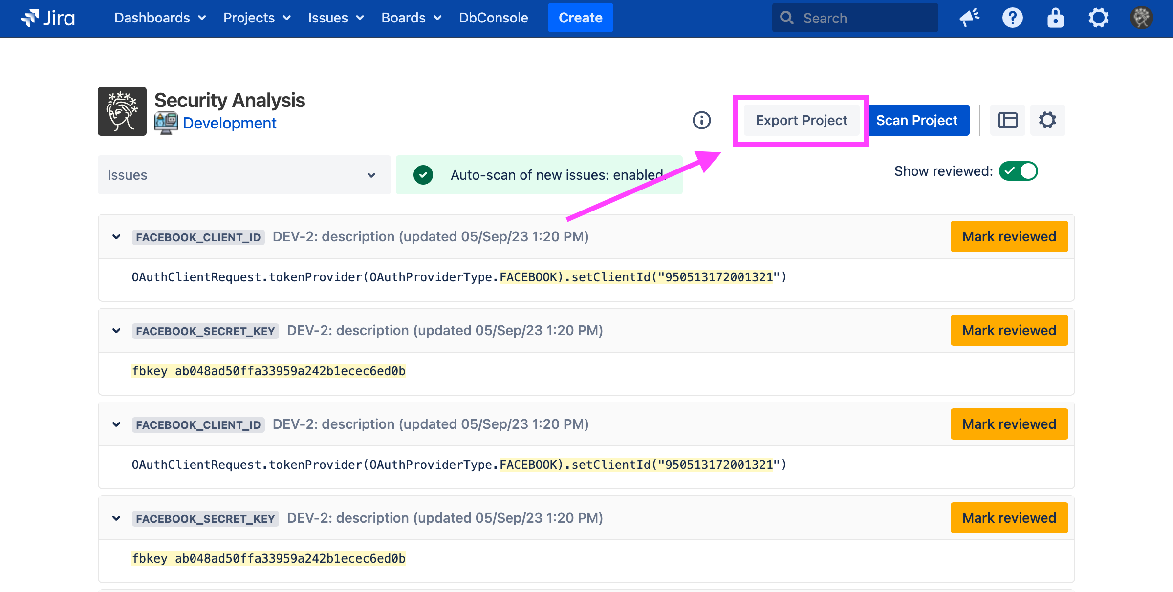 Security for Jira allows users to export CSV files containing findings in the projects for which they have administration privileges or, if they have been granted explicit app access, viewing privileges. This can be done when viewing a project’s Security Analysis by clicking the Export Project dropdown at the top: