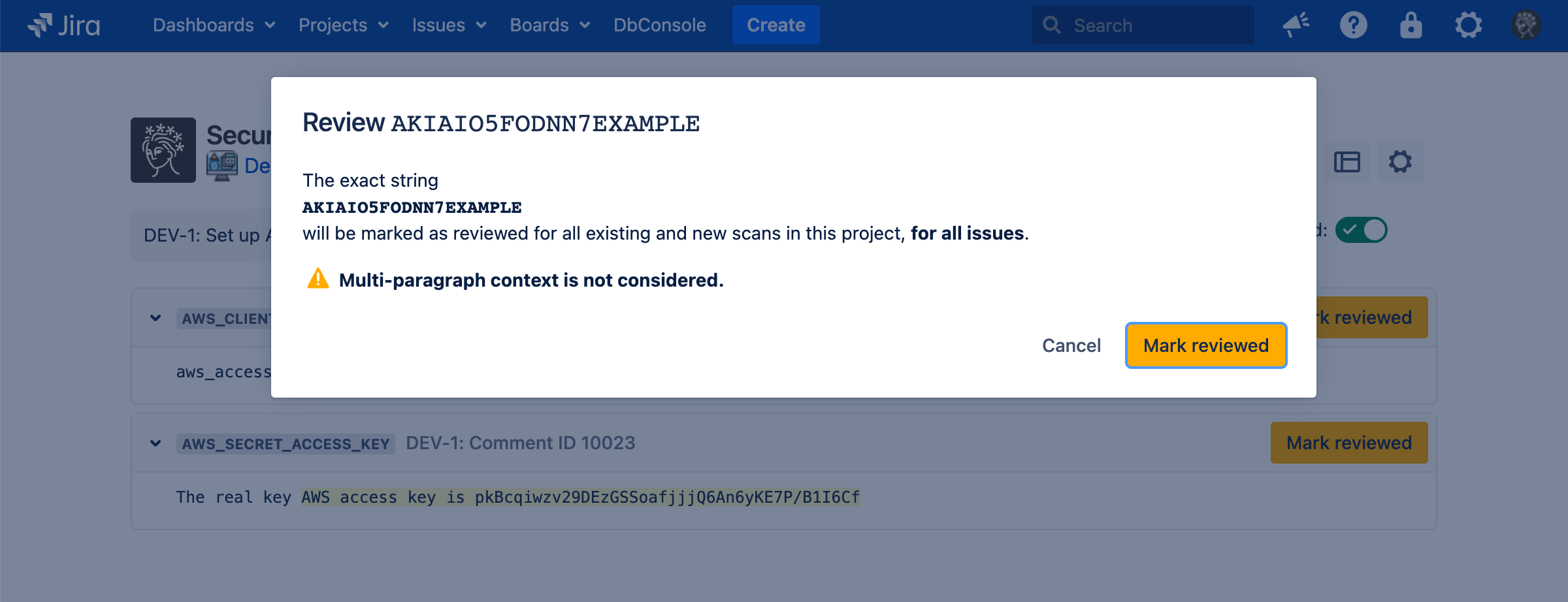 Marking a finding as reviewed saves the exact string captured by the rule (in this case, AKIAIO5FODNN7EXAMPLE). That exact string will be marked as reviewed for all existing and future scans.