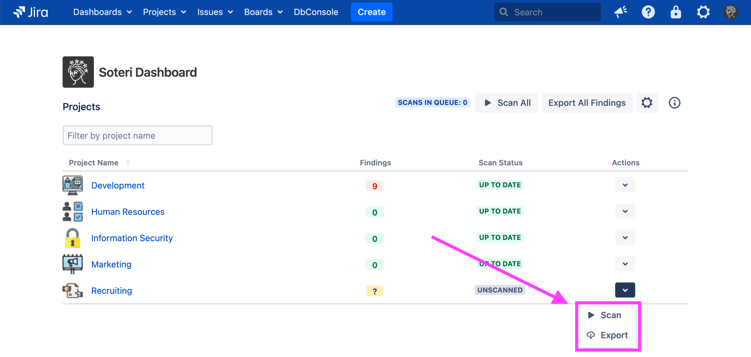 Clicking on a project’s “Actions” dropdown menu reveals the options “Scan” and “Export”:
