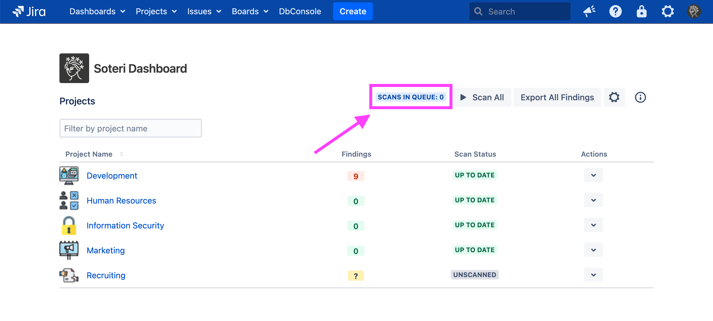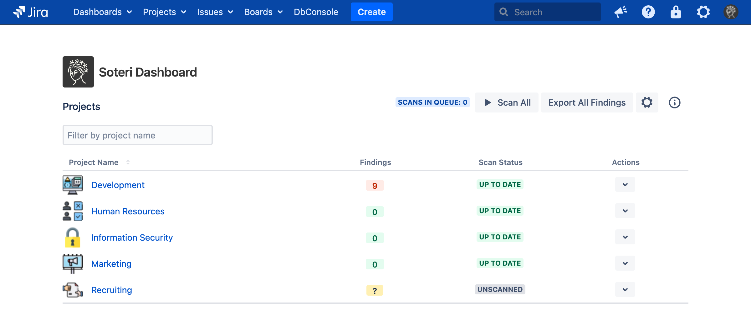 The Soteri Dashboard allows users to view the scan statuses of all Jira projects they administer, or if they were granted explicit app access, the Jira projects they can view. It can be accessed from anywhere within Jira by clicking the padlock icon at the top-right of the screen: