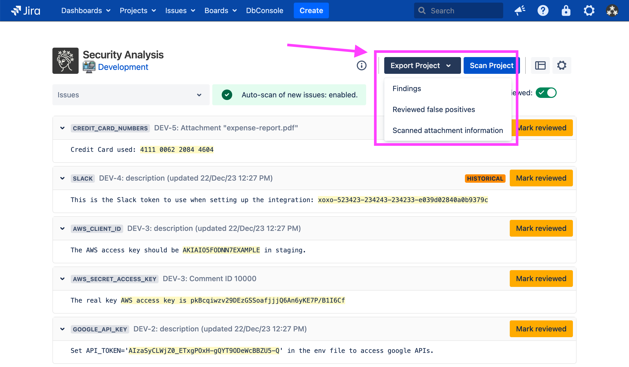 Security for Jira allows users to export CSV files containing findings in the projects for which they have administration privileges or, if they have been granted explicit app access, viewing privileges. This can be done when viewing a project’s Security Analysis by clicking the Export Project dropdown at the top: