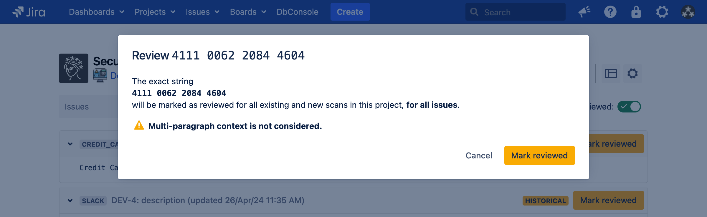 Sometimes, Security for Jira will find false positives, credentials which have already been revoked, etc. If this happens, you can review the finding. This marks the finding, as well as any other findings which exactly match it, as reviewed in the current and future scans.