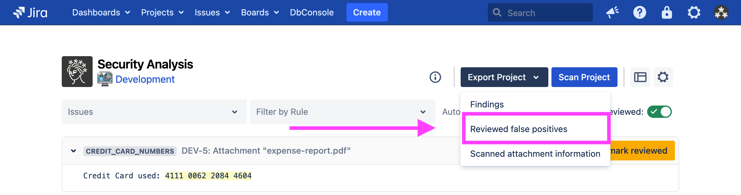 Marking a finding as reviewed saves the exact string captured by the rule (in this case, 4111 0062 2084 4604). That exact string will be marked as reviewed for all existing and future scans.