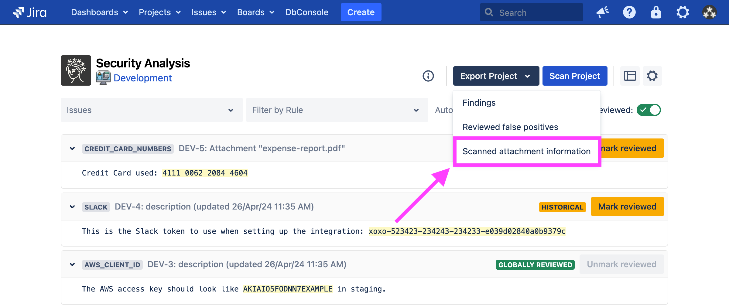 From the Security Analysis page, you can export attachment scan information for a specific project:
