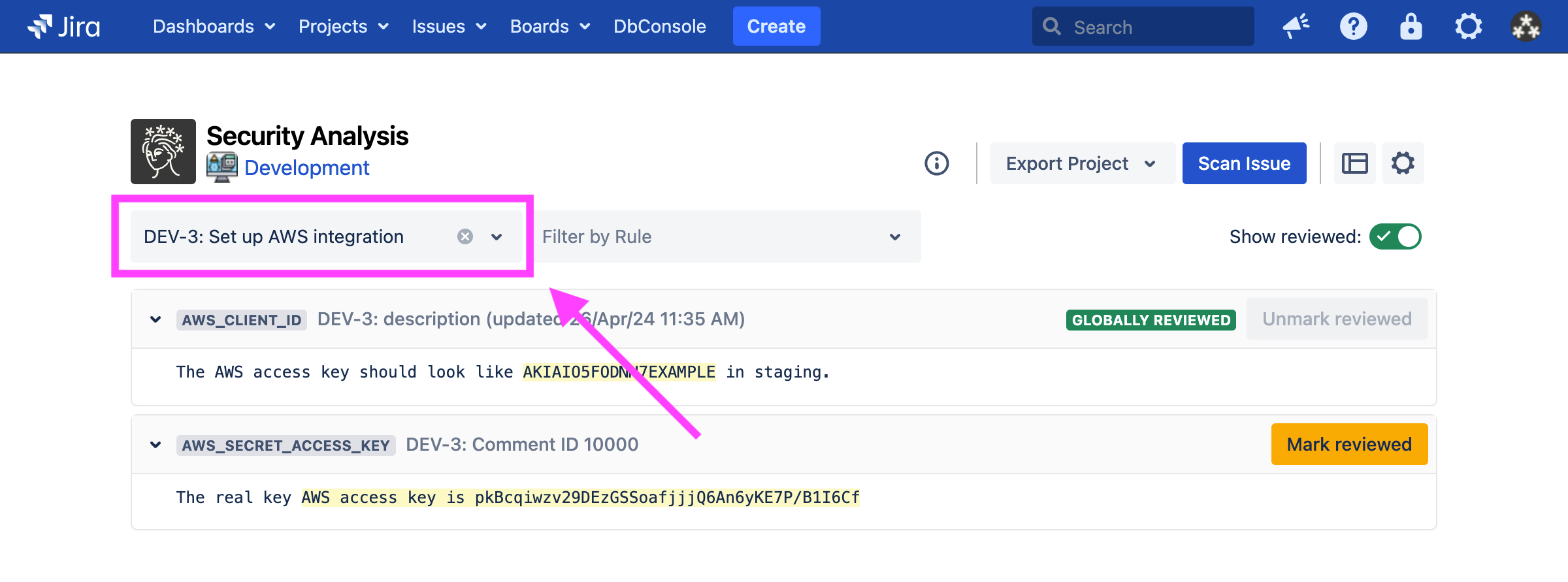 Or, while viewing the project in Jira, you can click on the padlock icon labeled “Security Analysis” in the side panel: