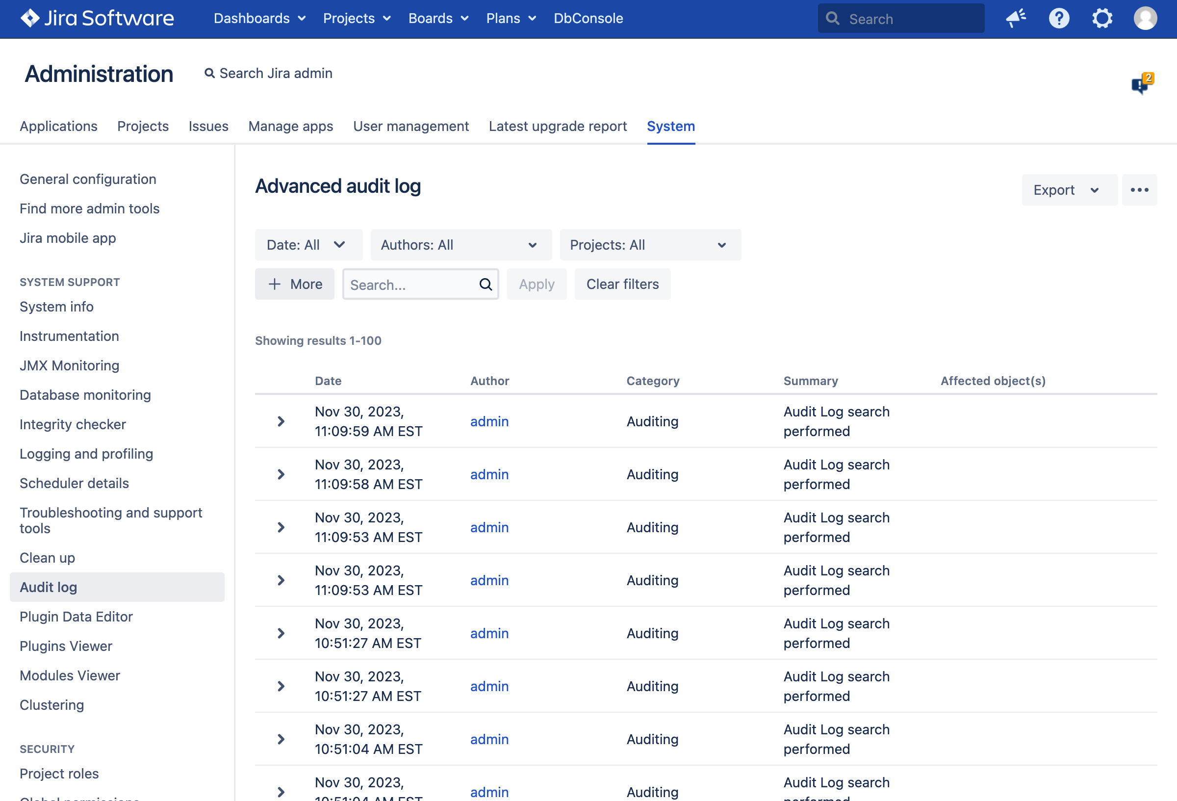 From the Jira administration page, select Audit log (under “Administration”) from the sidebar. This brings up the “Advanced audit log” page: