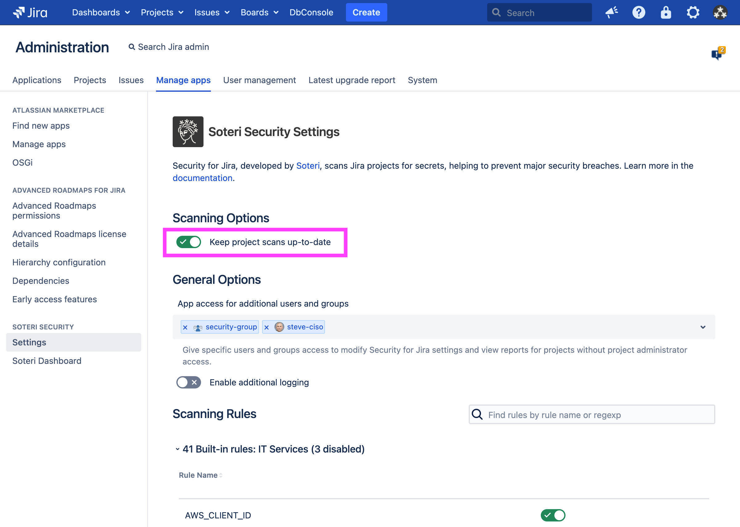 By default, Security for Jira will automatically scan newly created projects and imported projects. Also, for existing projects which have been scanned at least once, Security for Jira will automatically scan new and updated issues.