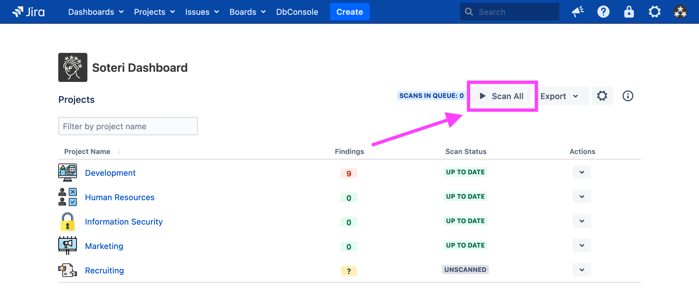 Jira administrators and any user granted explicit app access can see the Scan All button.