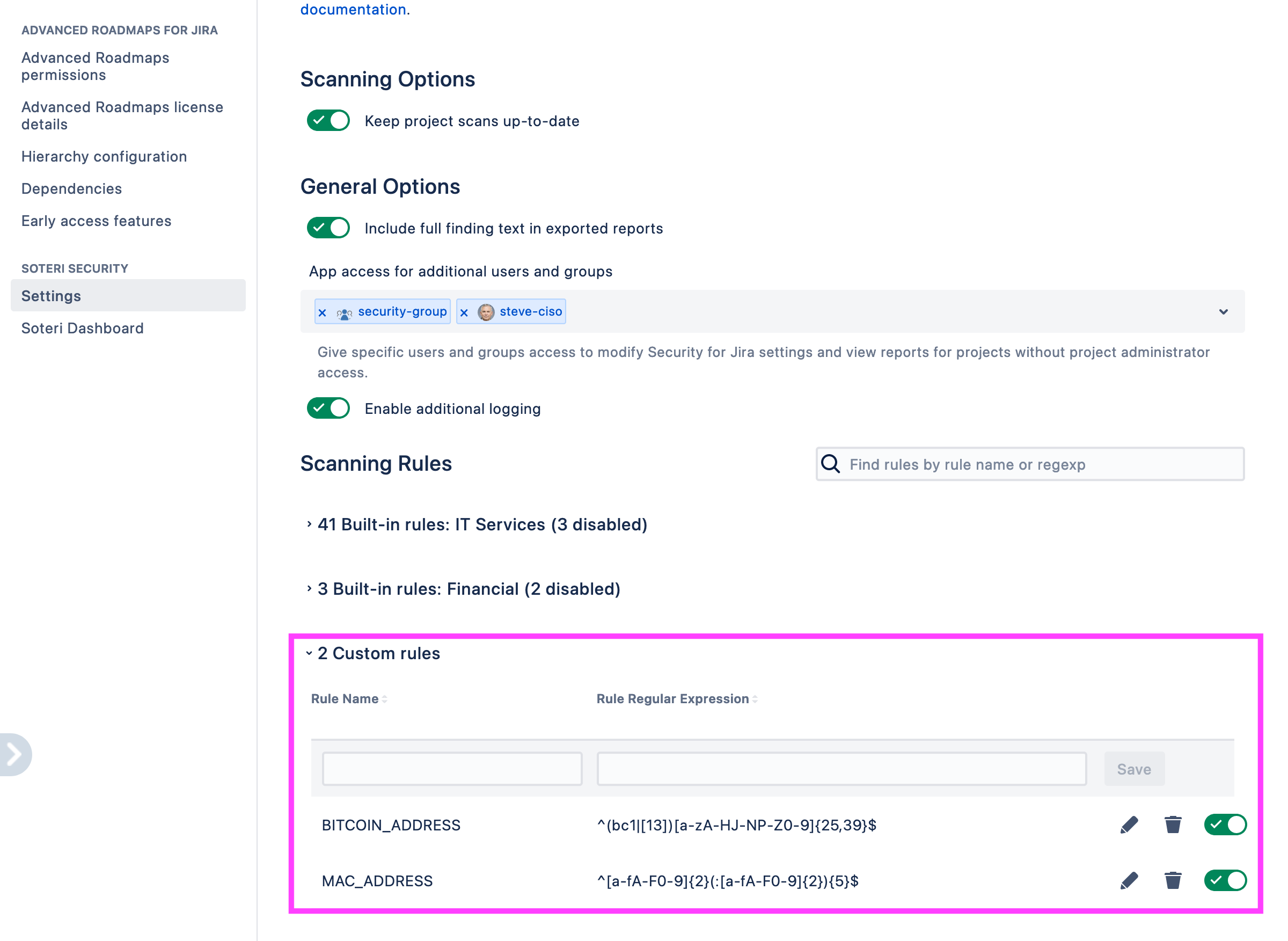 Security for Jira allows you to create custom scanning rules using regular expressions. You can create and edit custom rules from the Settings page, under “Custom rules”:
