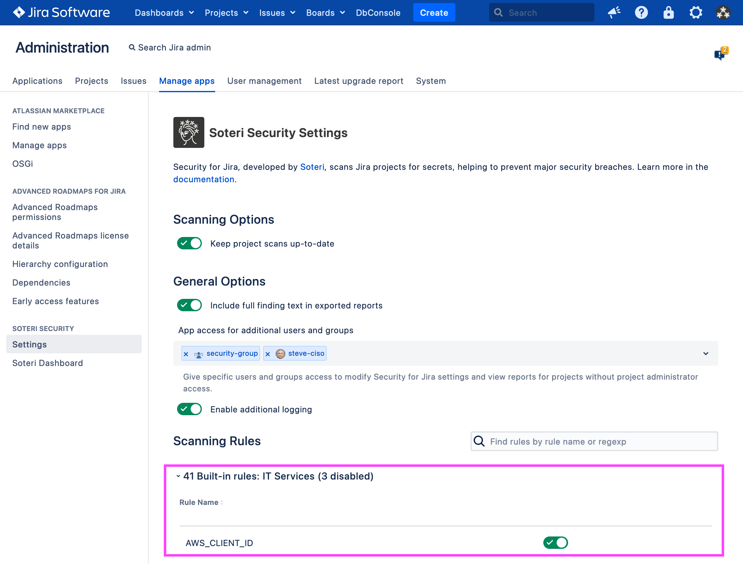 Security for Jira allows you to disable scanning rules that don’t fit the needs of your organization.