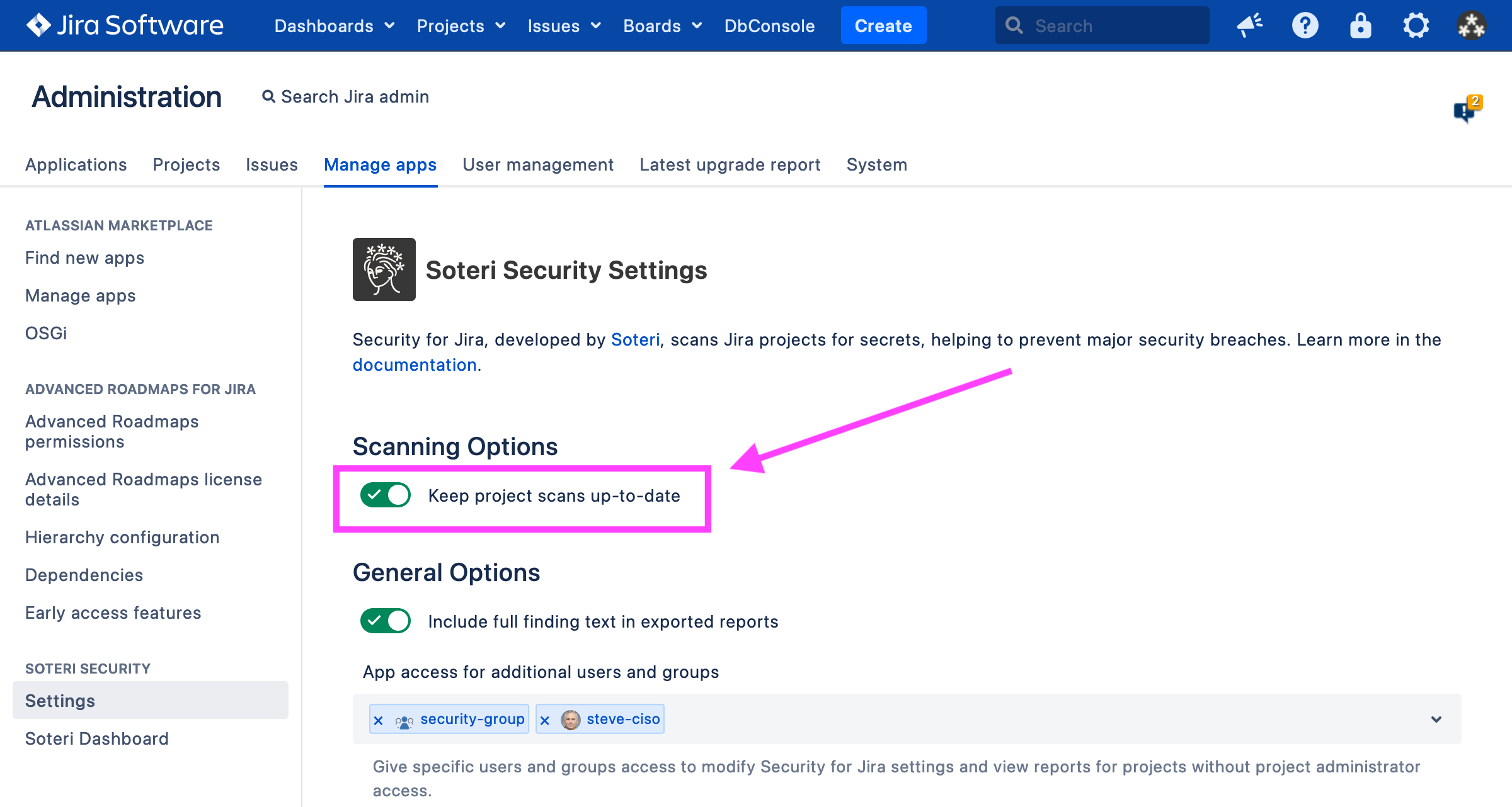 By default, Security for Jira will automatically scan newly created projects and imported projects. Also, for existing projects which have been scanned at least once, Security for Jira will automatically scan new and updated issues.