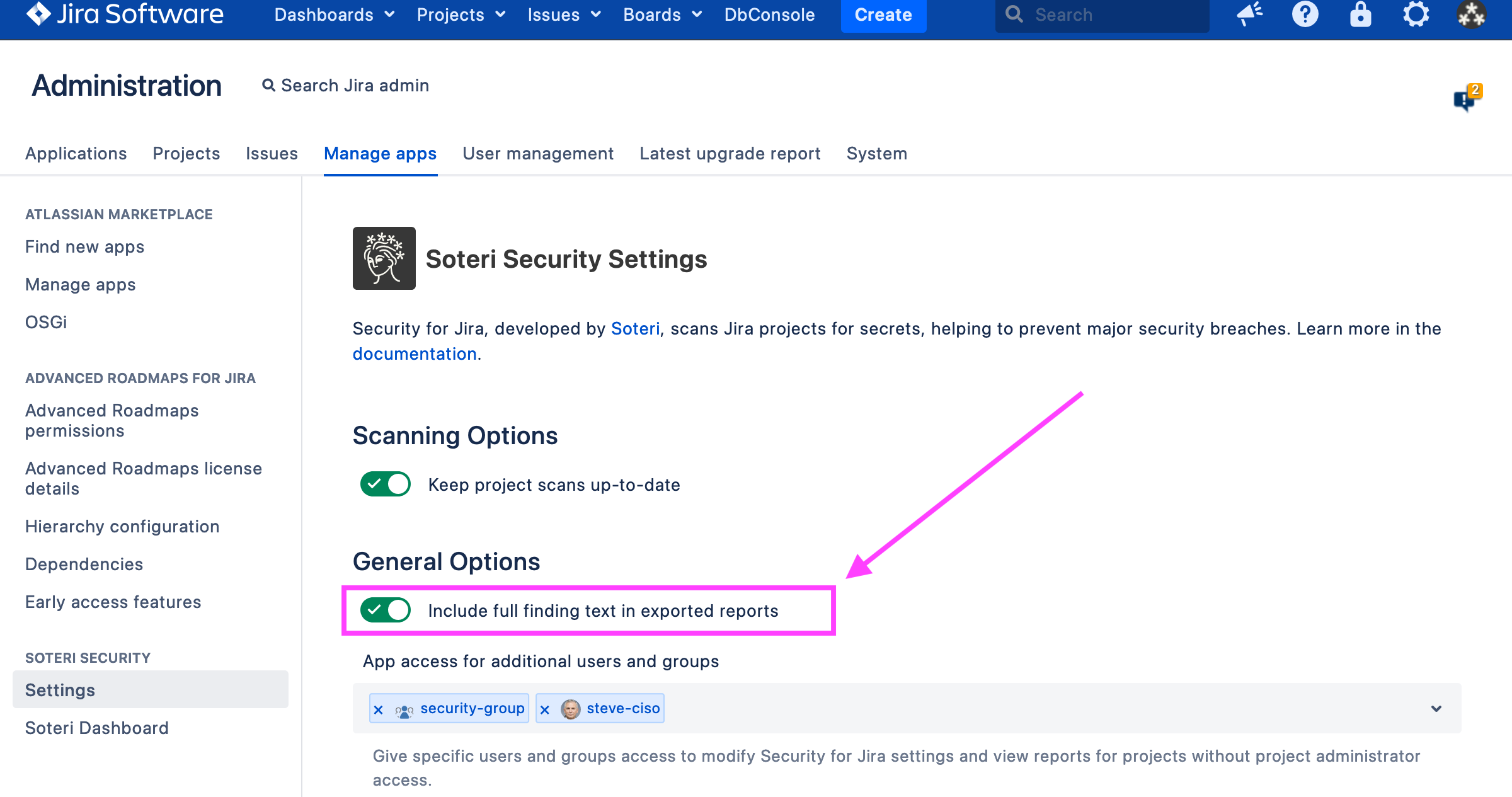Security for Jira allows users to export CSV files containing findings in the projects for which they have administration privileges or, if they have been granted explicit app access, viewing privileges. This can be done when viewing a project’s Security Analysis by clicking the Export Project dropdown at the top: