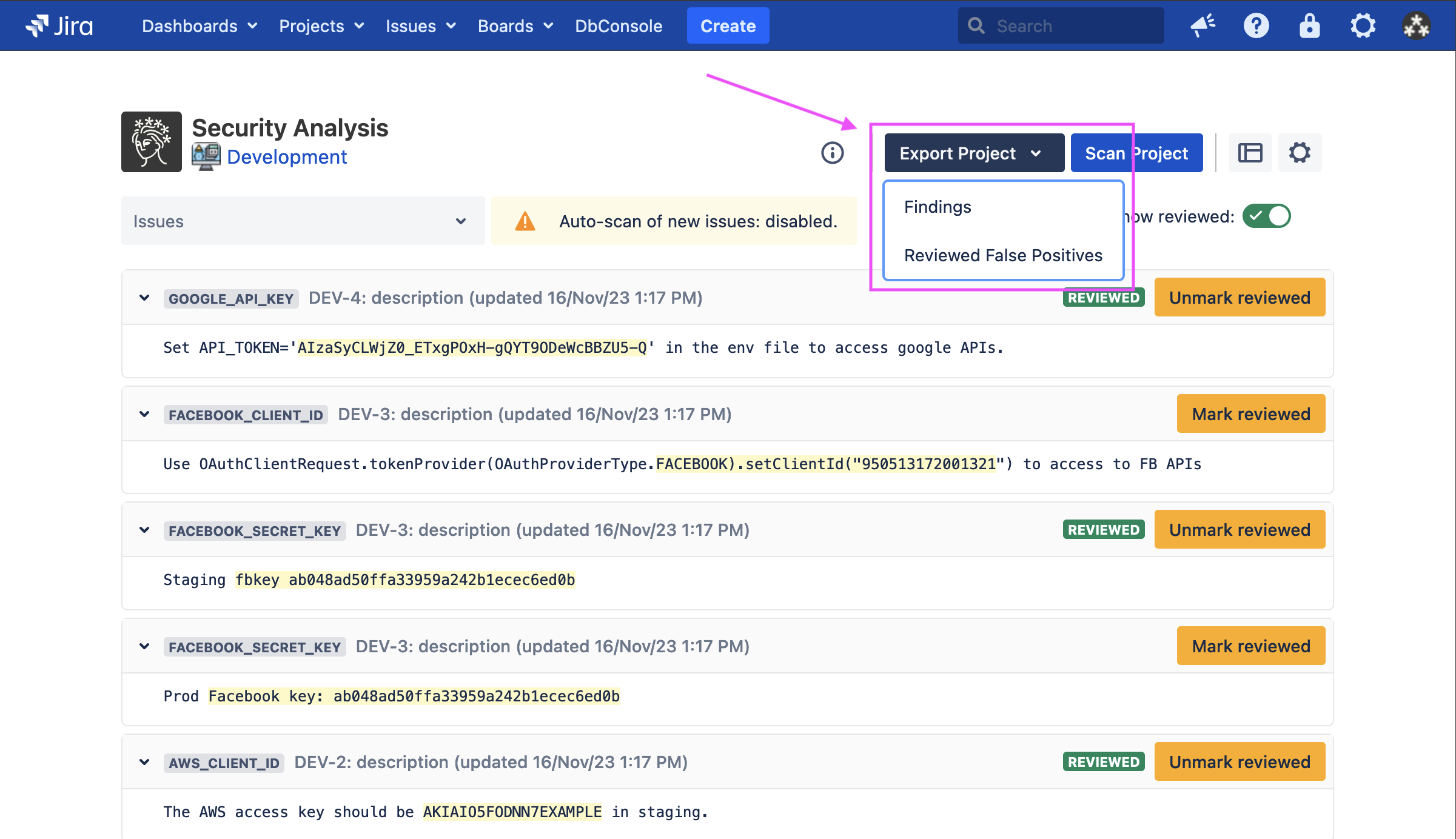 A Reviewed False Positives export contains reviewed false positives, including who reviewed them and when they were reviewed. Reviewed false positives are scoped per-project and apply to all future and past findings in the project that match exactly.