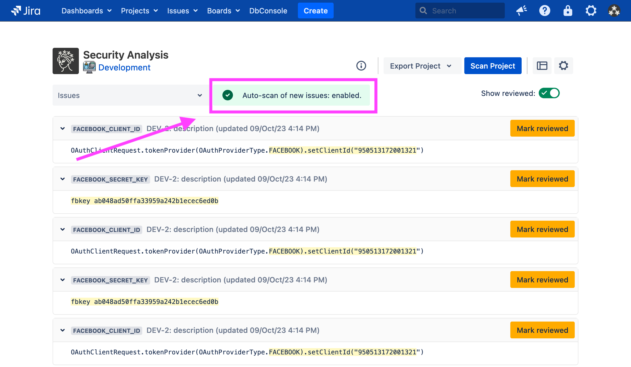 By default, Security for Jira will automatically scan newly created projects and imported projects. Also, for existing projects which have been scanned at least once, Security for Jira will automatically scan new and updated issues.
