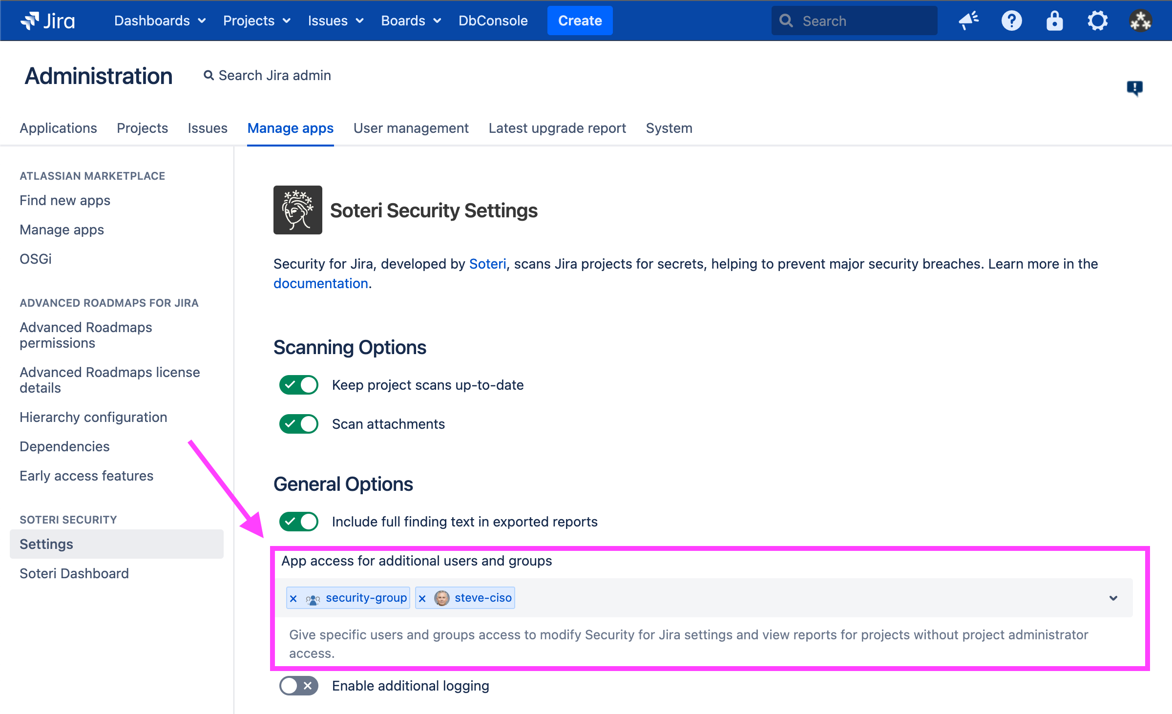 You may grant additional users and groups the ability to become App Administrators, which will allow them to view finding reports, mark findings reviewed, and change settings in the Security for Jira setting page.