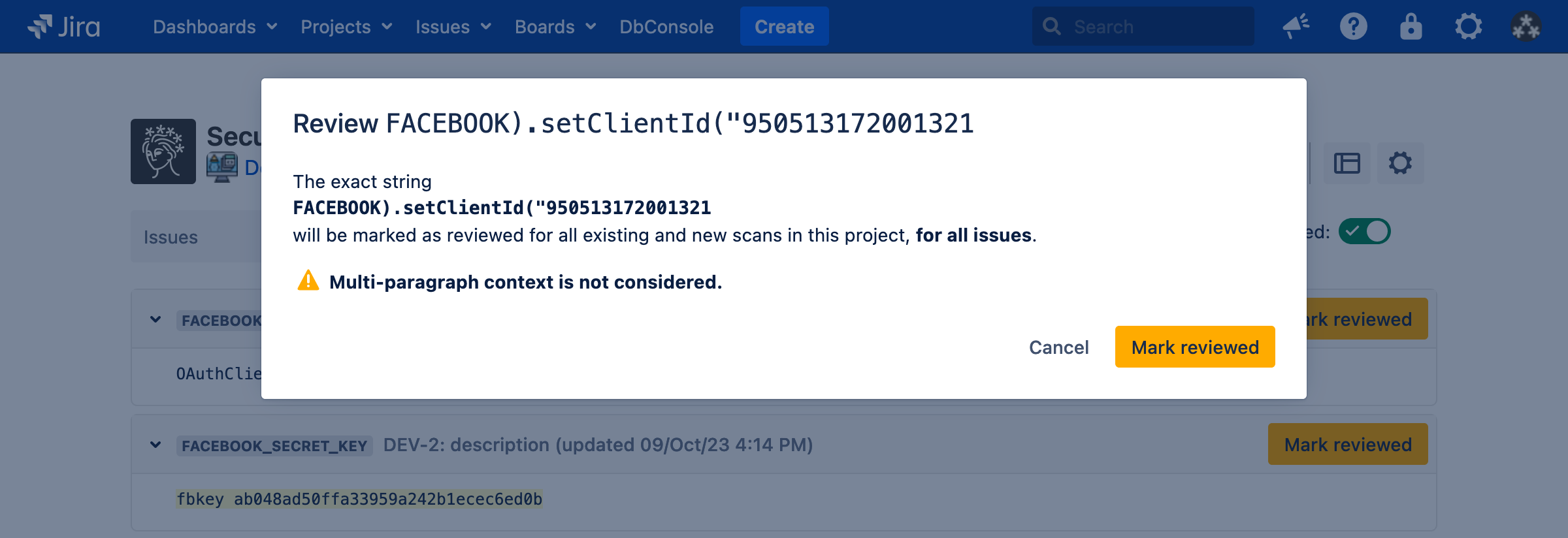 Sometimes, Security for Jira will find false positives, credentials which have already been revoked, etc. If this happens, you can review the finding. This marks the finding, as well as any other findings which exactly match it, as reviewed in the current and future scans.