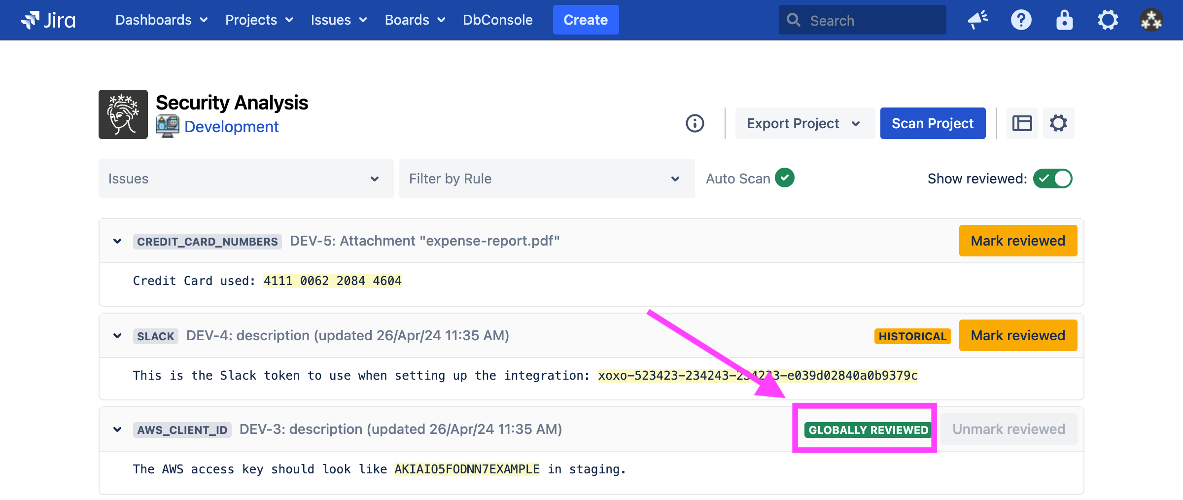 Sometimes, Security for Jira will find false positives, credentials which have already been revoked, etc. If this happens, you can review the finding. This marks the finding, as well as any other findings which exactly match it, as reviewed in the current and future scans.