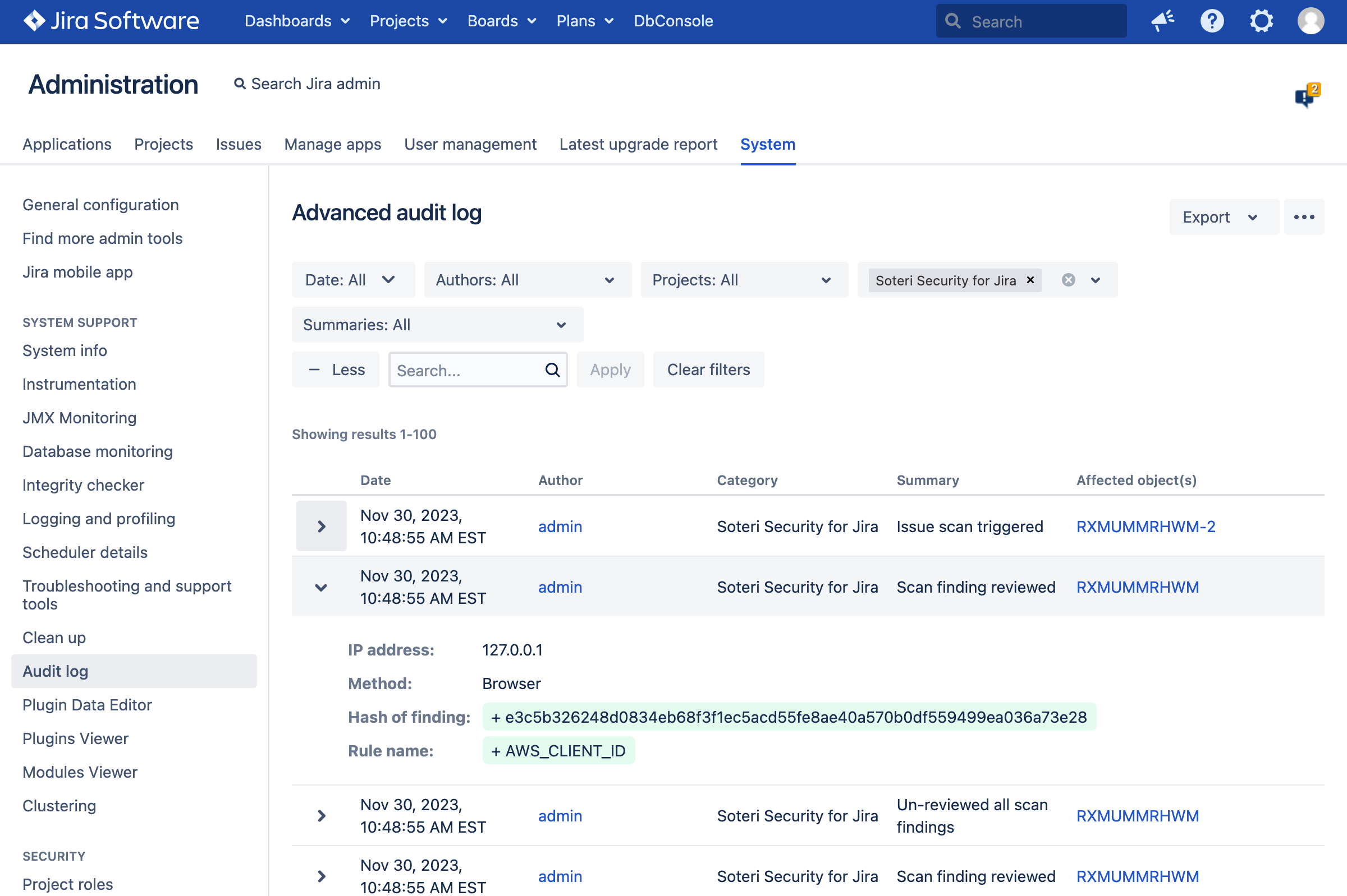 To help administrators keep track of various events, Security for Jira places entries in Jira’s Audit Log.