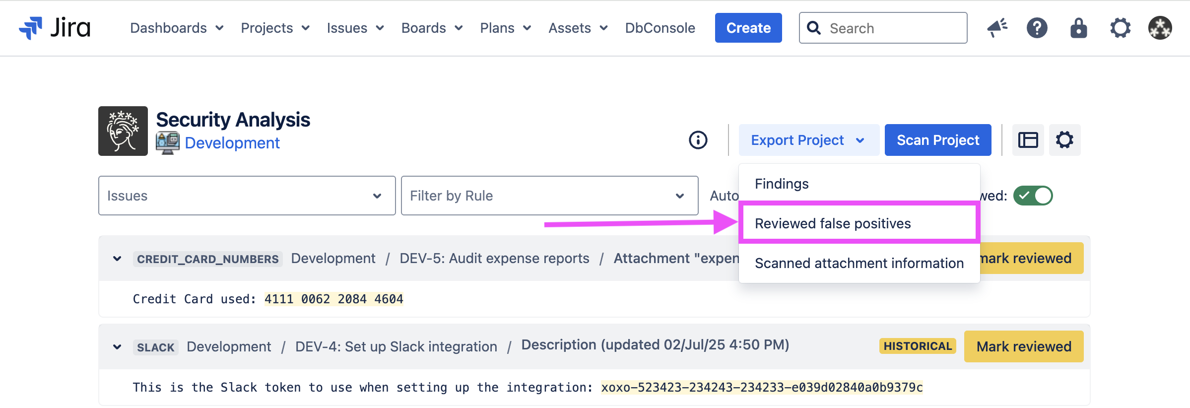 Jira administrators, or anyone granted explicit access (see Granting Access to Additional Users and Groups ) can add reviewed false positives which apply across all projects in your Jira instance using a CSV upload workflow.