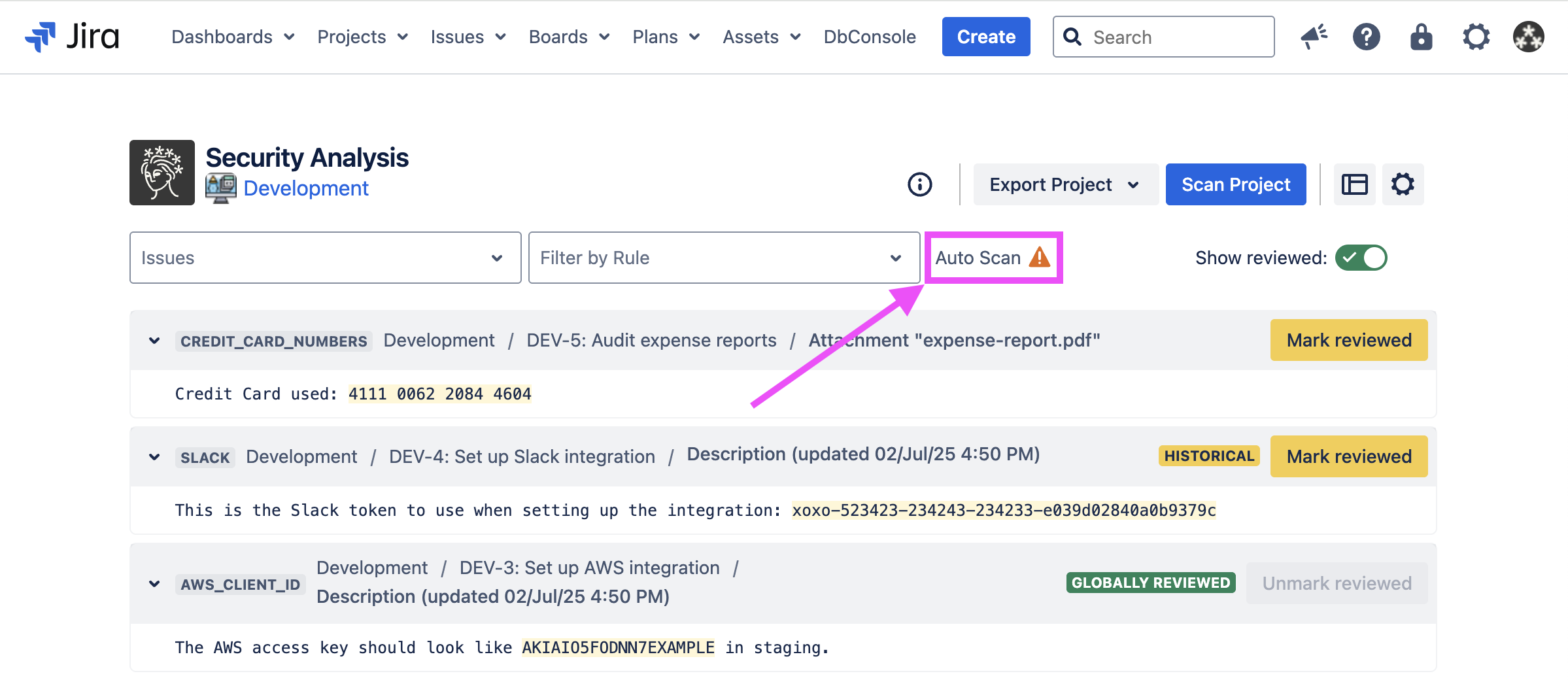 By default, Security for Jira will automatically scan newly created projects and imported projects. Also, for existing projects which have been scanned at least once, Security for Jira will automatically scan new and updated issues.