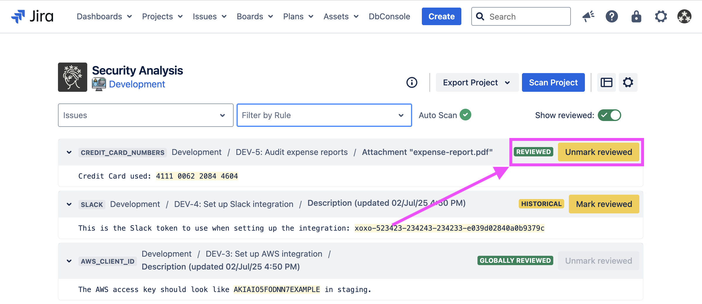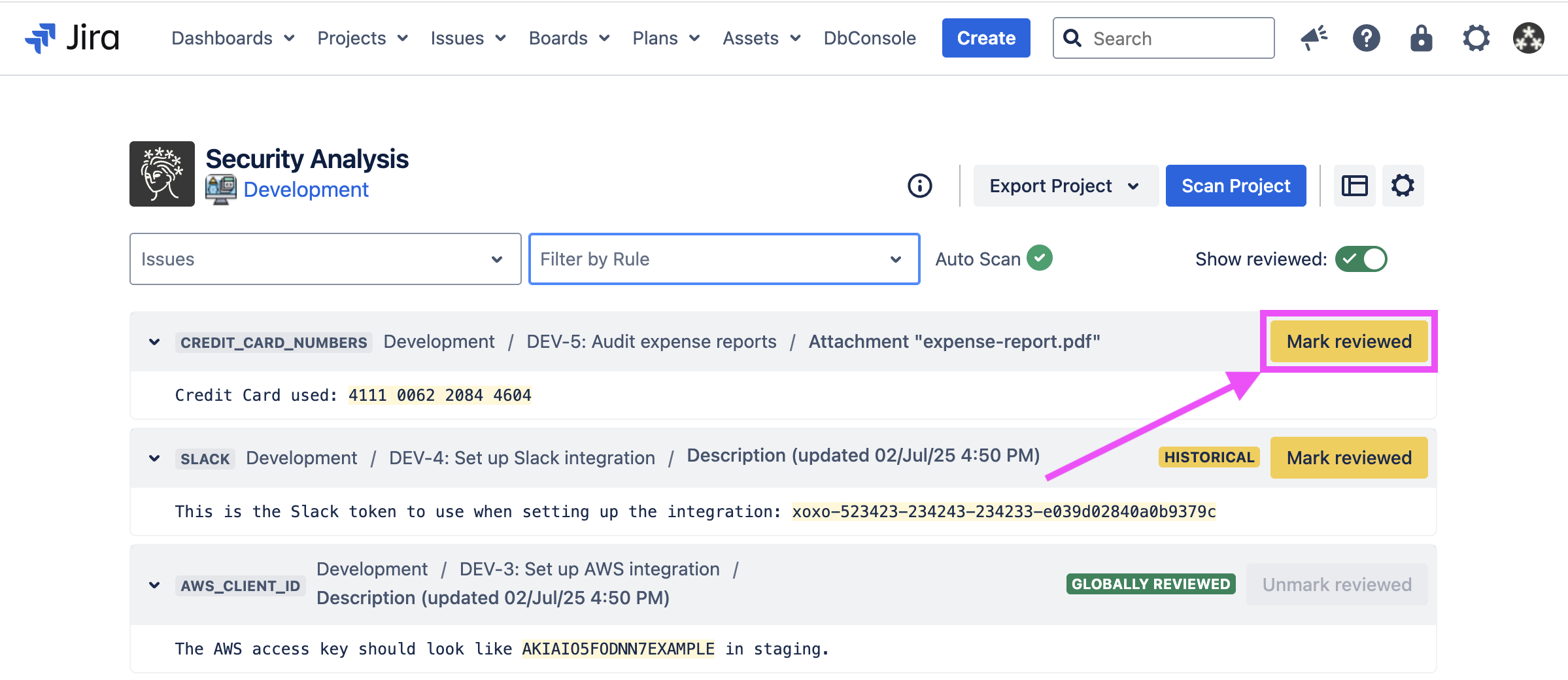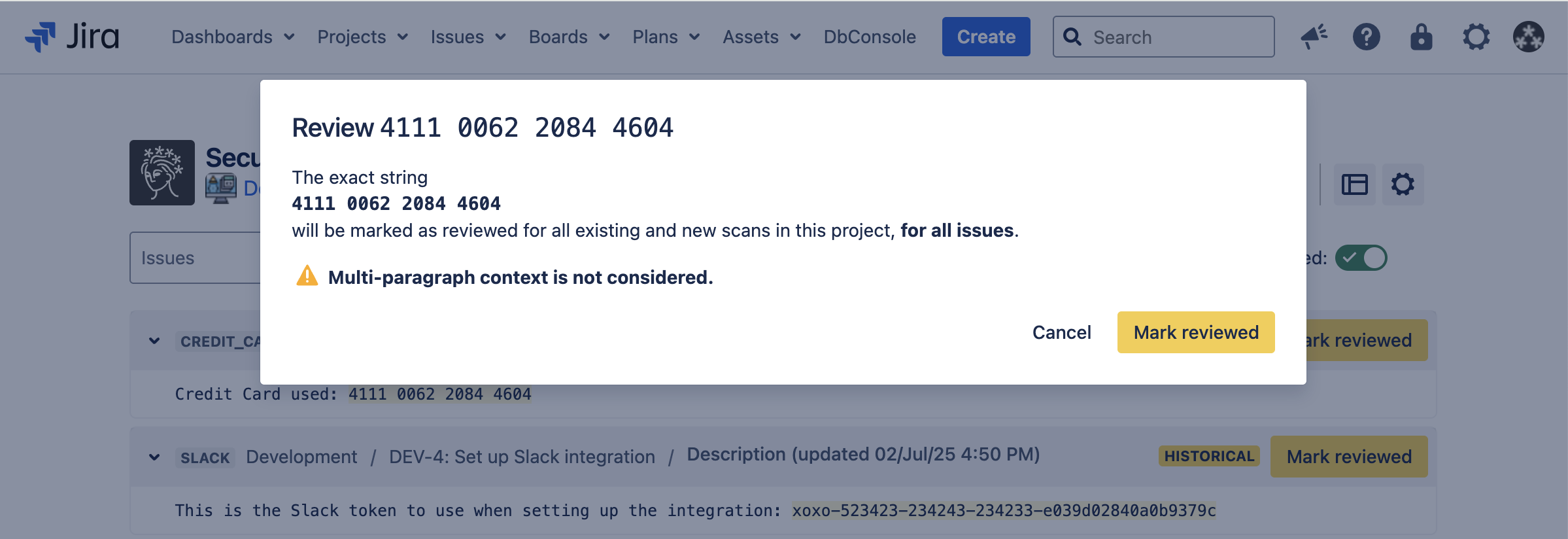 Sometimes, Security for Jira will find false positives, credentials which have already been revoked, etc. If this happens, you can review the finding. This marks the finding, as well as any other findings which exactly match it, as reviewed in the current and future scans.