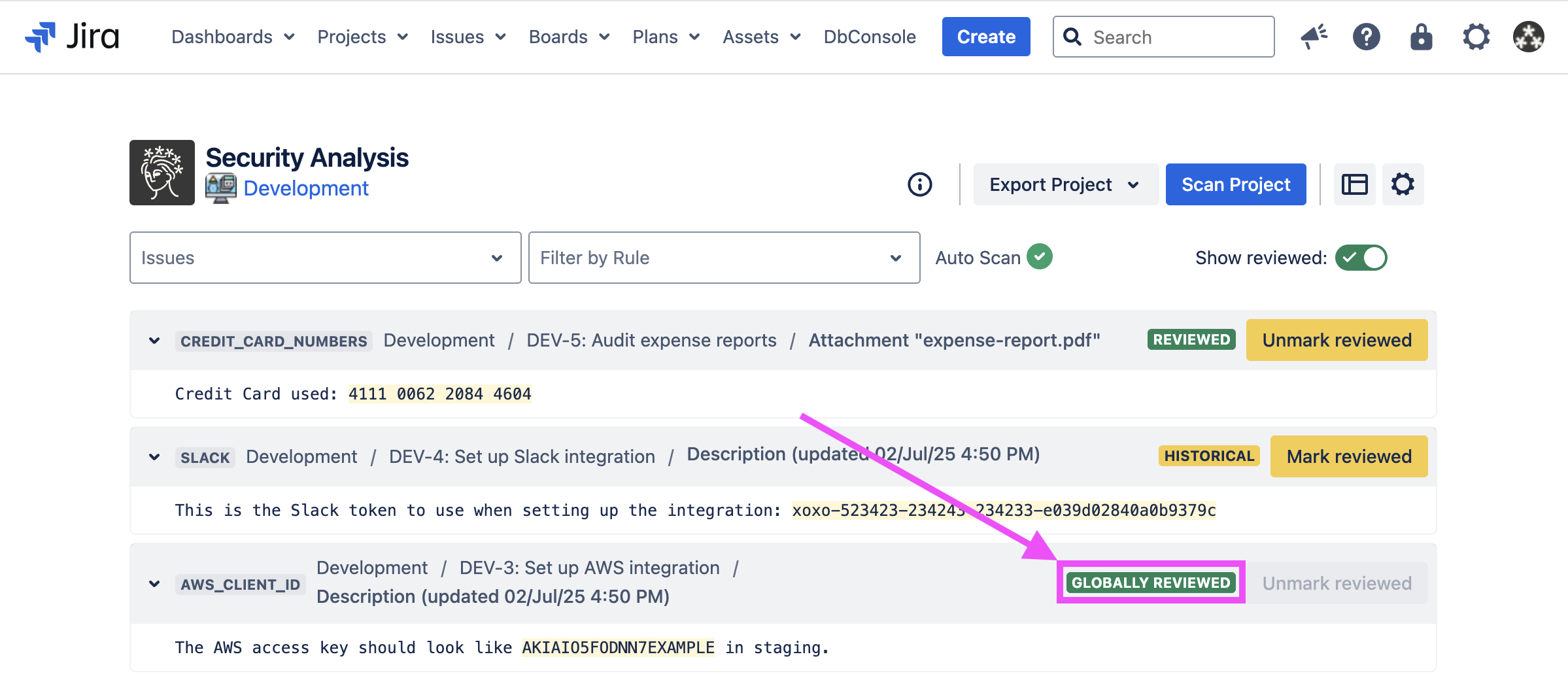 Sometimes, Security for Jira will find false positives, credentials which have already been revoked, etc. If this happens, you can review the finding. This marks the finding, as well as any other findings which exactly match it, as reviewed in the current and future scans.